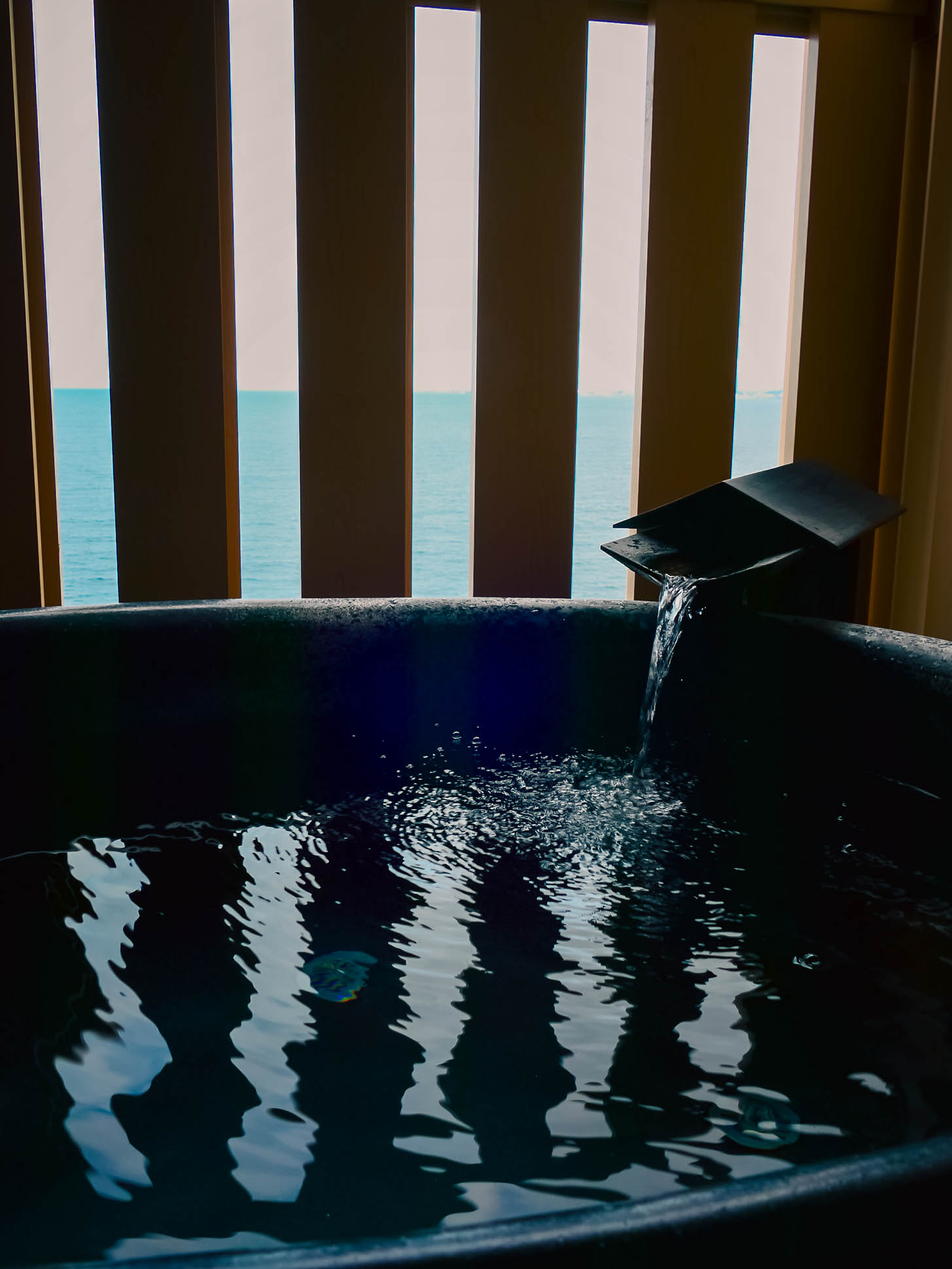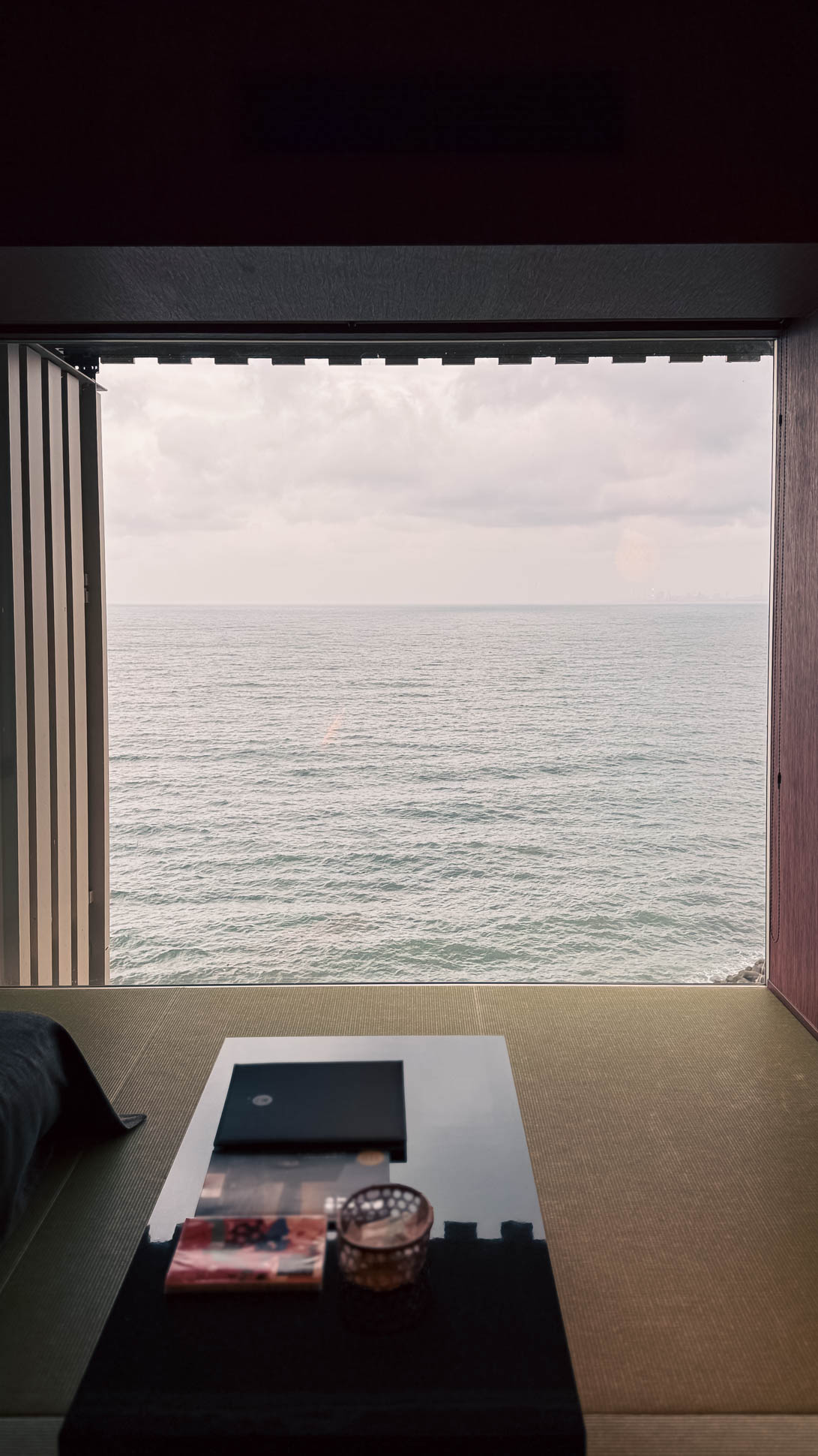 Rooms combine modern comfort with traditional Japanese style: tatami flooring, low beds or futons, sea views with large windows facing the bay, minimalist Japanese décor.